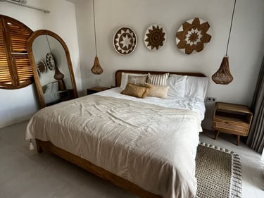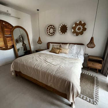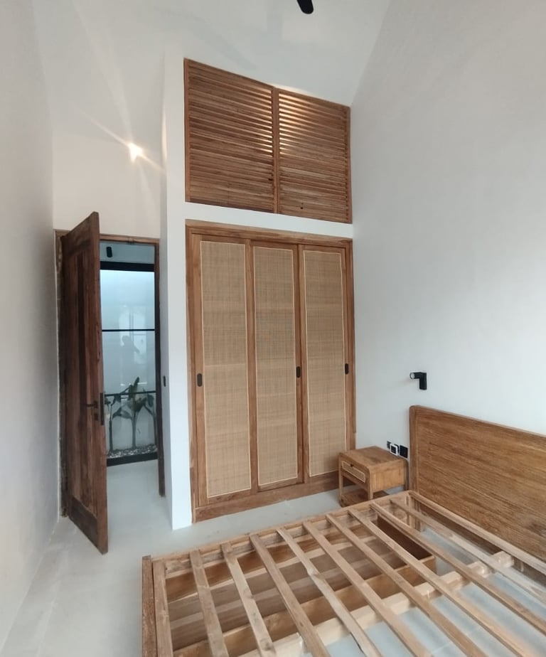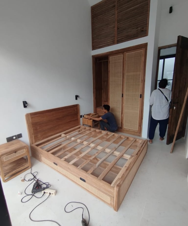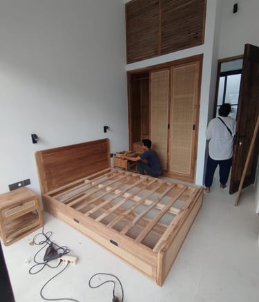 This interior project features custom furniture made of solid wood in a natural tropical style. The bed, bedside tables, and wardrobe are made of teak wood with a touch of rattan weaving, creating a warm and organic feel. The design emphasizes functionality and minimalist aesthetics, in harmony with the tropical atmosphere of Canggu.