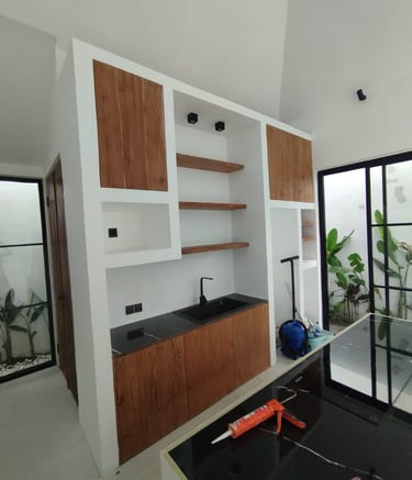 A comfortable space with a modern tropical feel. Natural wood touches combine with minimalist design, creating a functional and aesthetic kitchen and walk in closet. Elegant black table tops and warm wood accents make every corner of the house feel more alive. Perfect for those who love simplicity with a strong character.